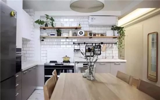如果家里厨房的结构是水槽与灶台分别在两面墙上,那刚好可以台面做成两个高度,“L”型拐角的地方做区分。如果是一字型厨房,那就需要中间做落差了。